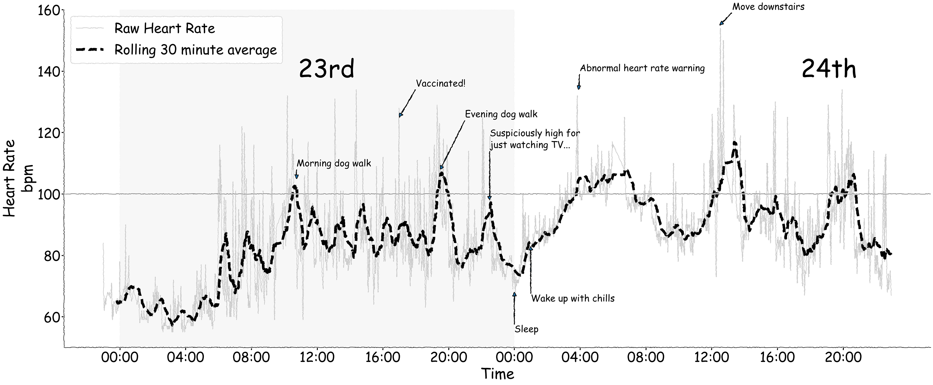 Extracting heart-rate data from a smartwatch after a vaccine-induced bad night, and plotting it in xkcd style.