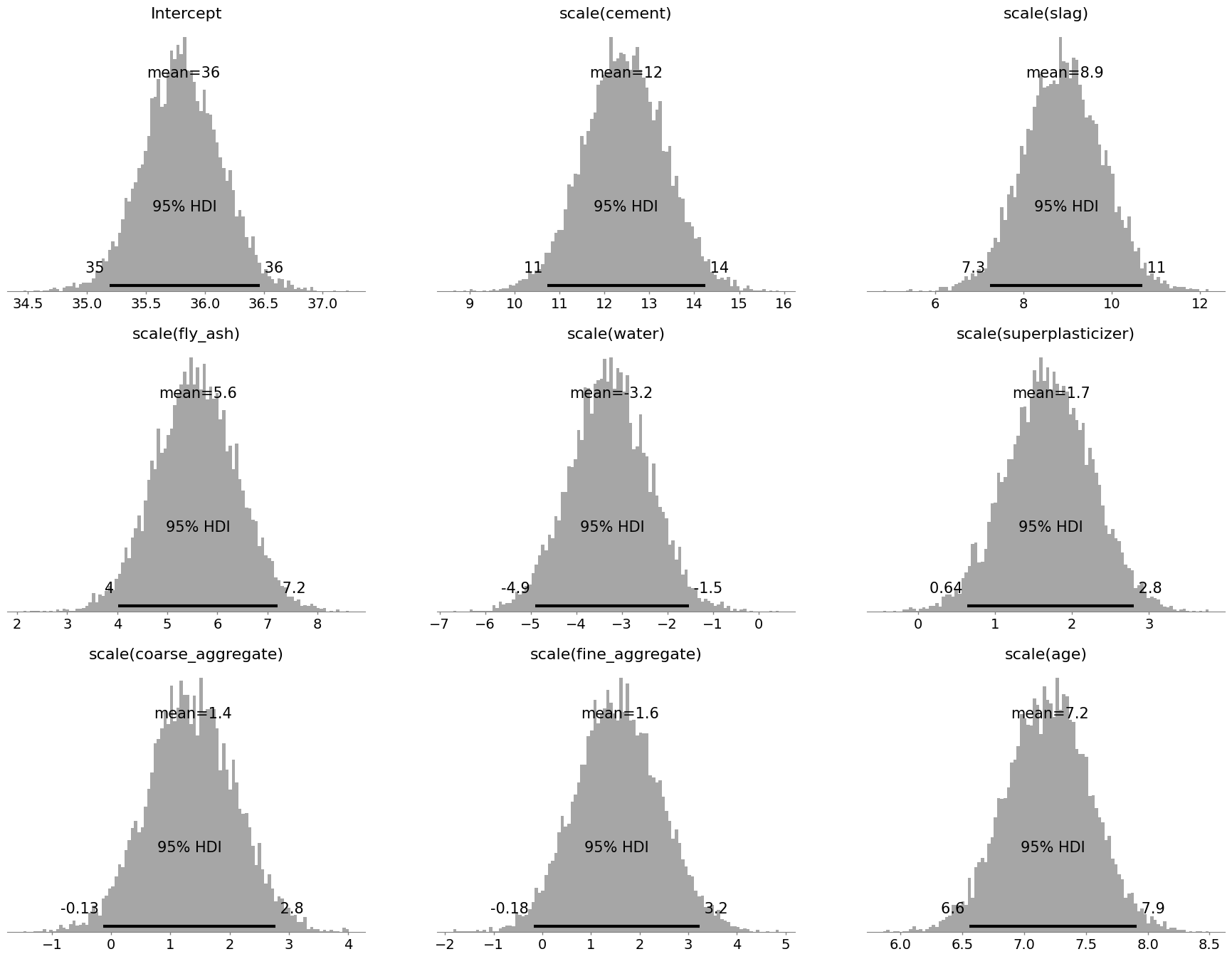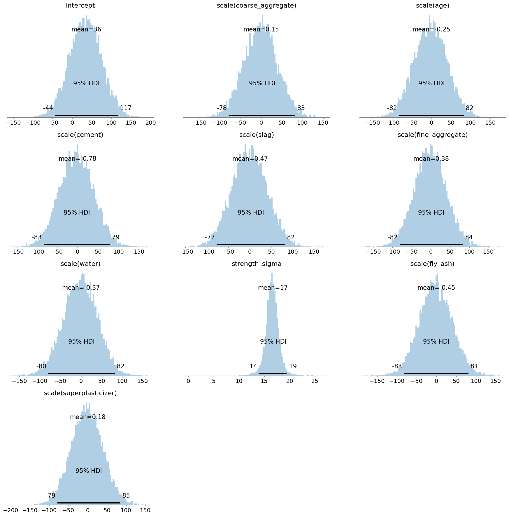 display(posterior_draws.apply(summarise_bayesian).round(3))| Intercept | cement | slag | fly_ash | water | superplasticizer | coarse_aggregate | fine_aggregate | age | |