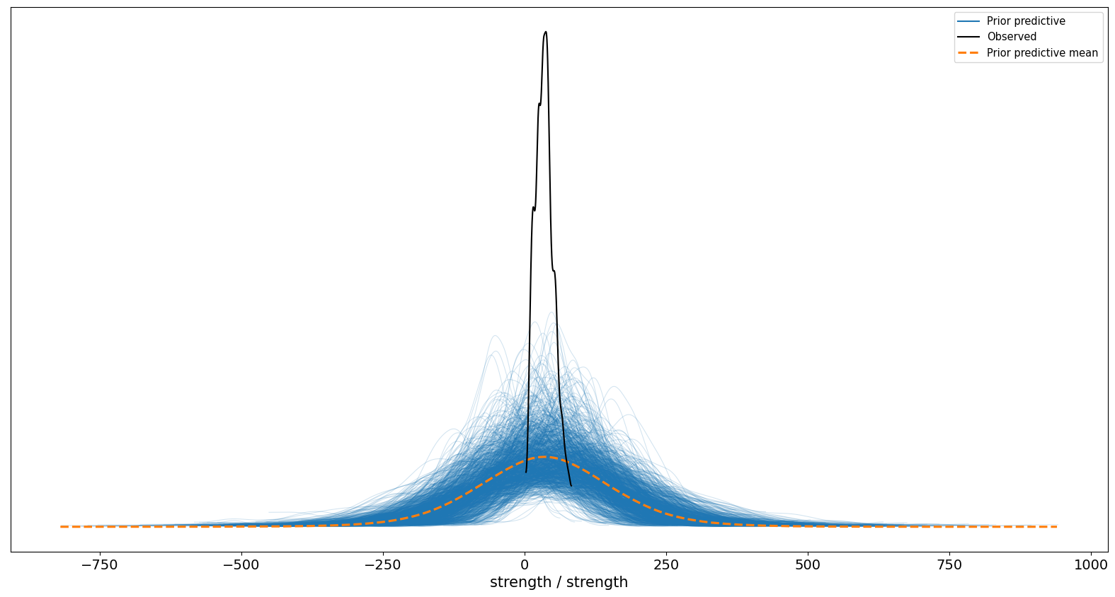 This is great. It shows us that the most likely effects for the main predictors are hovering around zero, but that the effect could be as big or small as about ±80 strength units. Sometimes people accuse priors of ‘influencing’ the data; but this is clearly not happening much here as those effects are very broad. Next, we check a ‘prior predictive’ distribution, which will give us an idea of what the model thinks the strength variable itself looks like, based on - The observed data for our predictors, and - Our prior distributions for the coefficients