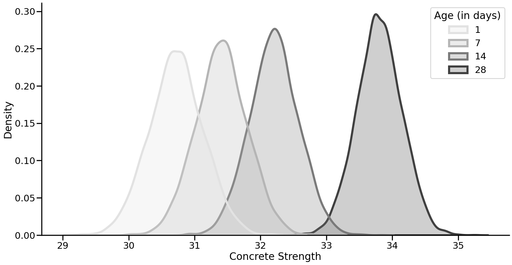 ax.get_legend().set_title('Age (in days)')| Age (in days) | Mean Strength | Lower Strength Credible Limit 95% | Upper Strength Credible Limit 95% |