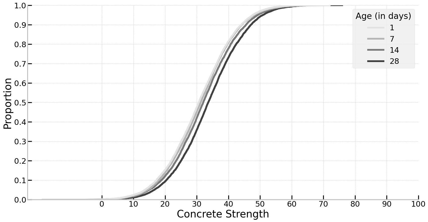 While this sounds complex, in reality what it gives us is simple: a probability distribution for a single datapoint for what it may look like in future, after taking the model into account. This is really important for the application at hand, given that concrete strength is critical for a lot of work! Specifically we can look past the mean of the distributions - that is, what is the average concrete strength for a given 14 day old sample - but instead estimate likely values we may see in future. Let’s examine this below and see what the distributions look like for the different ages using an empirical cumulative distribution plot. As will be seen, density plots will be too messy here.