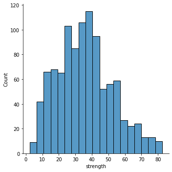 sns.displot(df['strength'])cement False