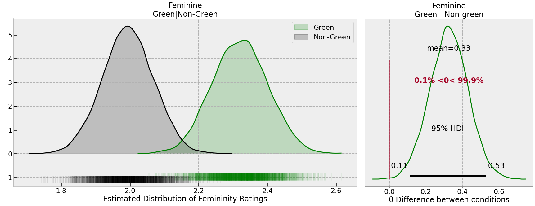 Thus far, the conclusion is that there is a positive effect of green behaviour on perceptions of femininity in general — the probability that the ratings of femininity are higher for green behaviour is 99.9%, and the BF for the alternative is 48.87. While this indicates the presence of an effect, the overall effect is relatively small, with the upper bound being only around half a rating scale point. This may — or may not — be psychologically practical or relevant.