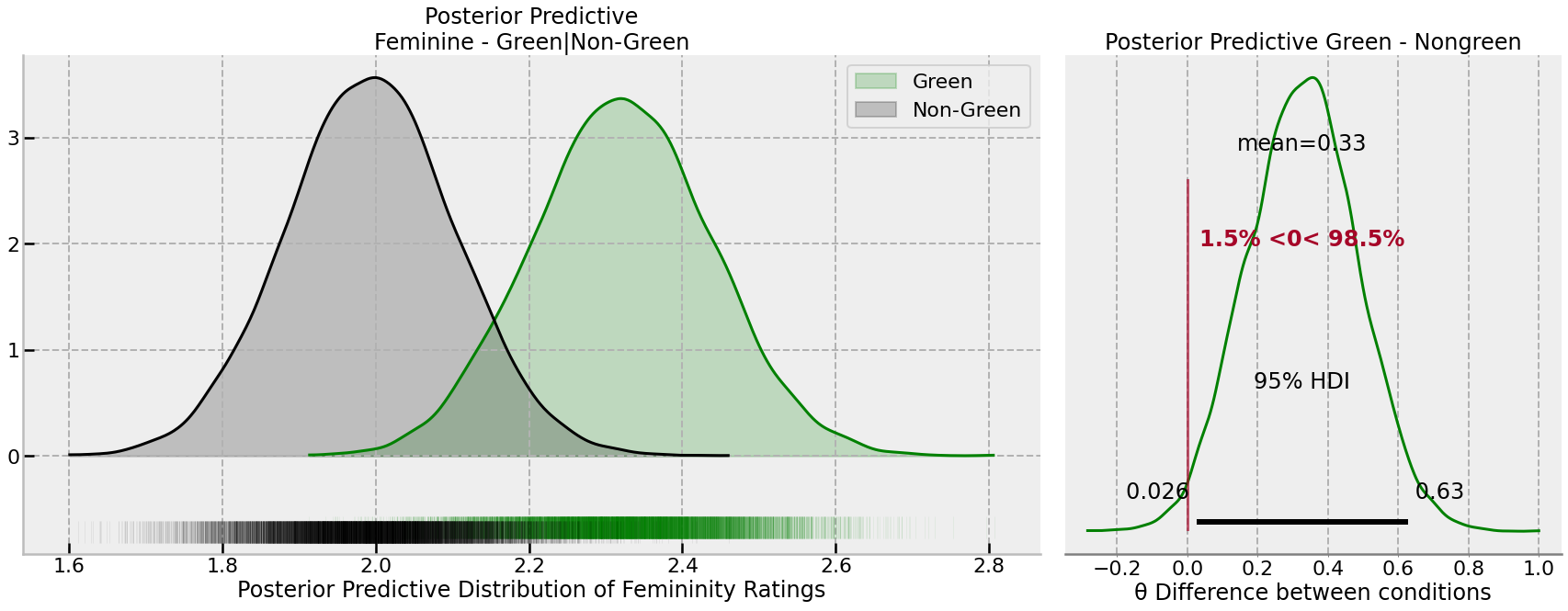It is also possible to examine the posterior predictive distribution of the data, which takes into account both the uncertainty in the sampling of participants, as well as the uncertainty in the parameters of the model. By generating the posterior predictive distribution, it will be possible to examine the differences between green/nongreen behaviour that could be expected in future, as opposed to a focus on the average effect. Examining this may give more insight into the expected size of the effect in actual data-point terms, as opposed to the mean. We conduct this analysis below, focused on the green/non-green difference for femininity ratings.